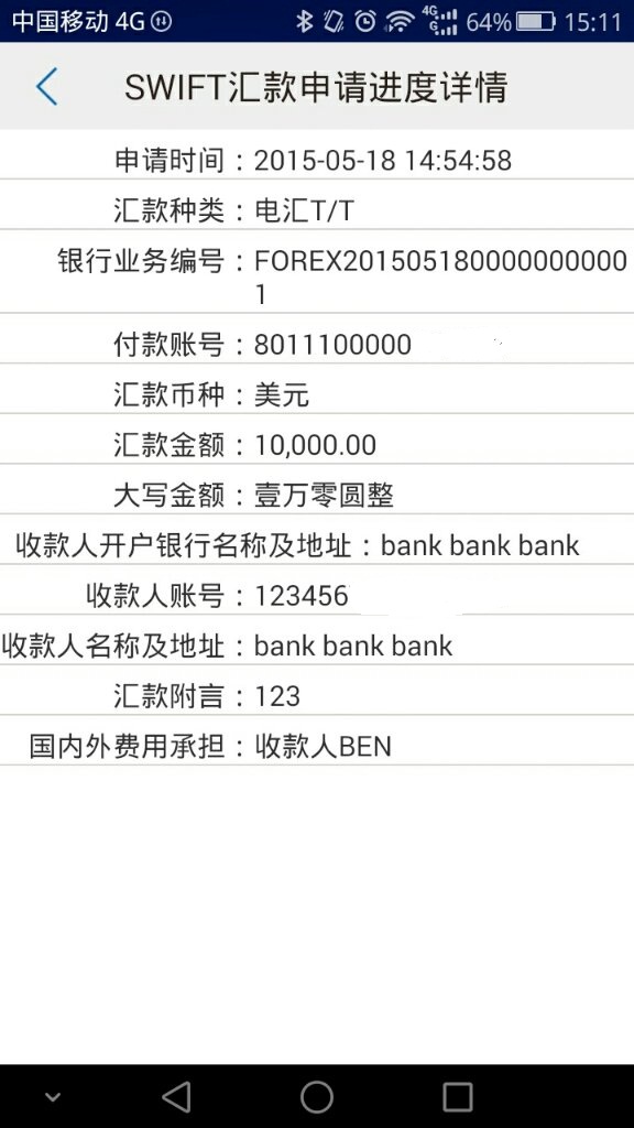 2、继续点击可以查看某条记录的具体信息。您可以查看到该笔记录申请时间、汇款种类、银行业务编号、付款账号、汇款币种、汇款金额、大写金额、收款人开户银行及地址、收款人账号、收款人名称及地址、汇款附言、国内外费用承担