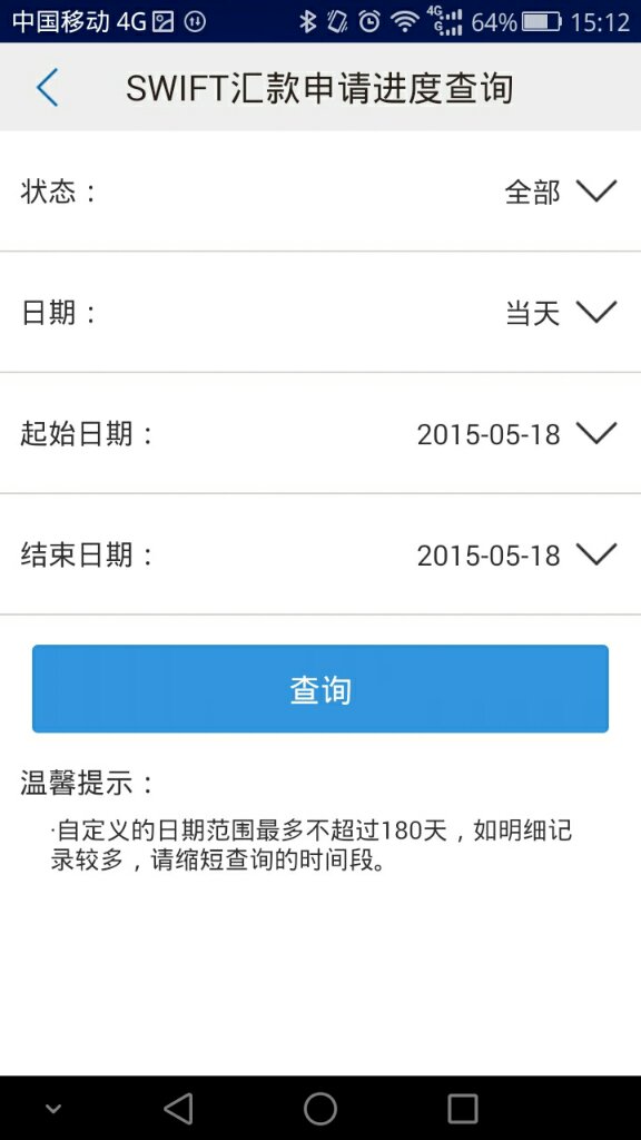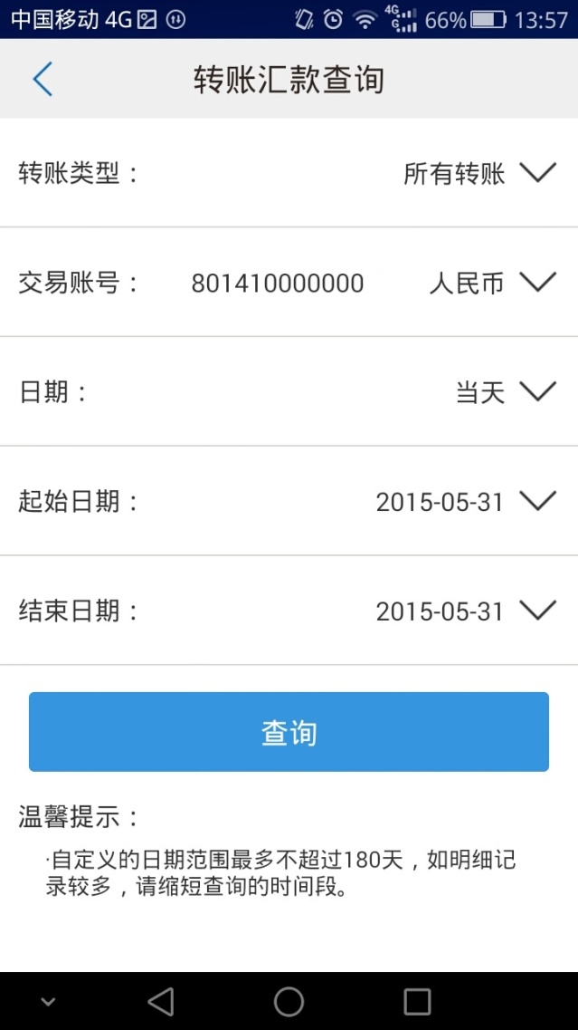 可查询该时间段内的转账汇款详情。自定义日期范围最多不超过180天,如记录明细较多,请缩短查询的时间段。