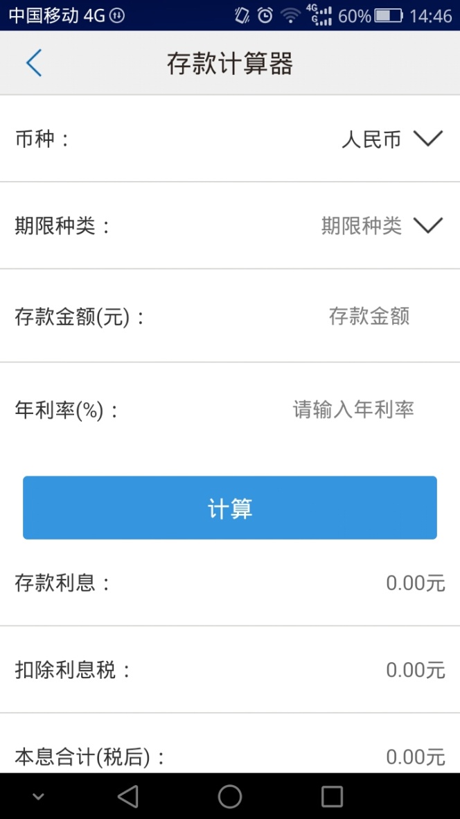 选择币种,期限种类,输入存款金额,年利率,点击计算。
