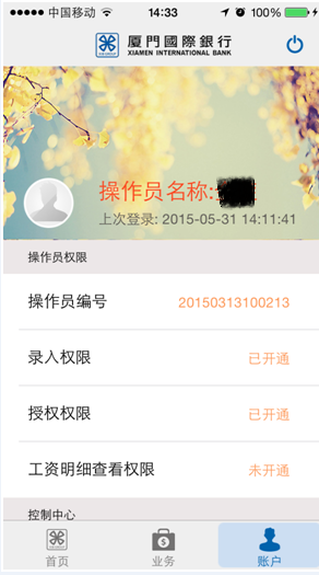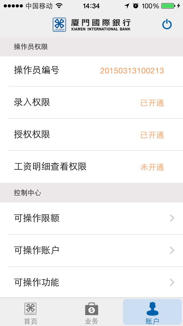 在控制中心栏内,选择可操作限额,进入可操作限额查询界面。选择可操作账户,进入可操作账户查询界面。选择可操作功能,进入可操作功能查询界面。权限只能查看,无法在手机端自行进行修改。