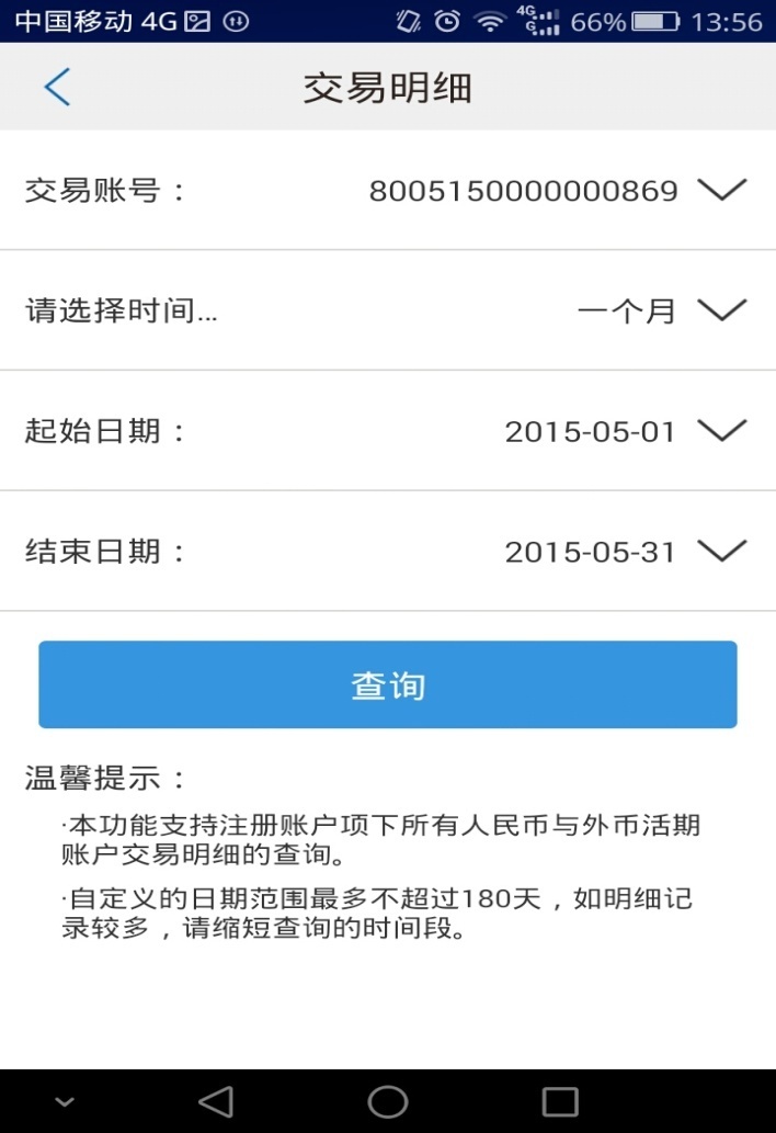 2、选择交易账号,输入起始日期及截止日期,可选择“当天、一周、一个月、自定义”,本功能支持注册账户项下所有人民币与外币活期账户交易明细的查询。自定义的日期范围最多不超过180天,如明细记录较多,请缩短查询的时间段