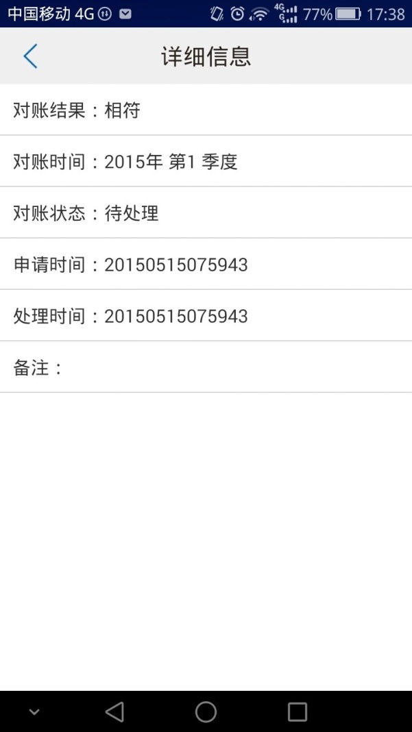继续点击可以查看该条记录的详细信息。如对账结果,对账时间,对账状态,申请时间,处理时间,备注。