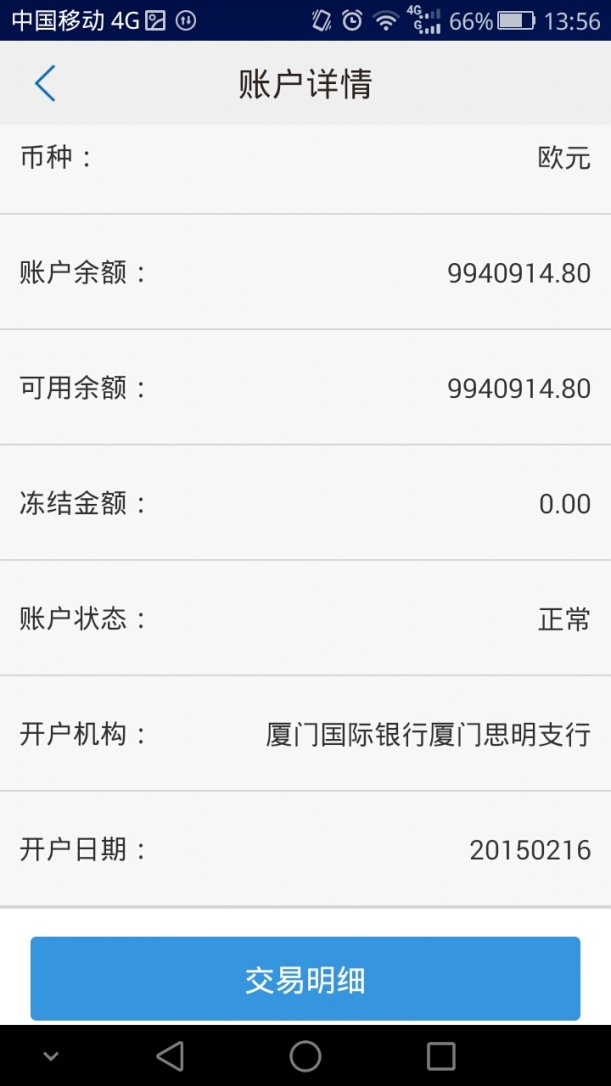 2.选择账号进入,可查询到该账户(活期)的户名、账号、币种、余额、可用余额、状态等账户详情或者该账户(定期)的户名、账号、币种、余额、类型、到期日等账户详情或者该账户(保证金)的账号、币种、余额、可用余额、保证金种类、到期日等账户详情;
