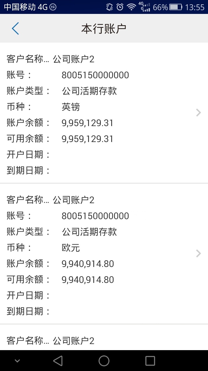 1.显示企业客户名下所有活期账户、定期账户及保证金账户等概括信息(包括单位名称、账号、账户类型、币种、账户余额、可用余额、开户日期、到期日)。