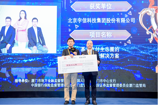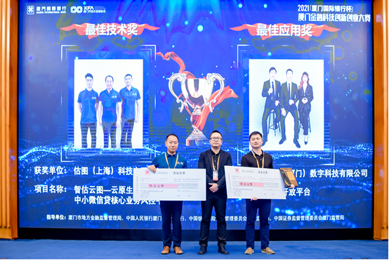 中国人民银行厦门市中心支行党委委员、副行长黄涛为大赛最佳技术奖和最佳应用奖获奖项目颁奖