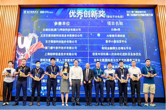 厦门市地方金融协会会长徐智艺、厦门国际银行股份有限公司时任首席信息官,现任首席科学家王鹏举为大赛优秀创新奖获奖项目颁奖