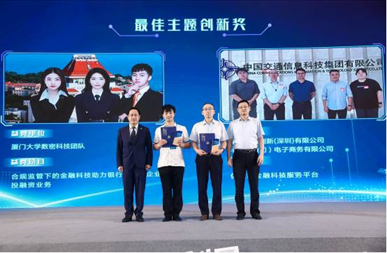 厦门国际银行行长曹云川、中国人民银行厦门市分行科技处处长林榆为最佳主题创新奖获奖项目颁奖