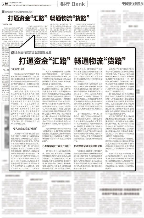 铁路、公路、水路、民航……看得见的“货路”轨迹四通八达,串联起了全球实体经济,而在背后,“看不见”的“钱流”同样日夜不息,资金货款跨国接收支付,国际贸易得以持续健康开展。在这个过程中,商业银行扮演关键角色,以厦门国际银行为例,在中国首个自由贸易试验区所在地上海,面对民营物流企业海外收付款的实际需求,该行通过对客户、对业务的细致尽调,在依法合规、管控风险的前提下,打通“汇路”梗阻,助力民营物流企业“出海”之路畅行无阻。