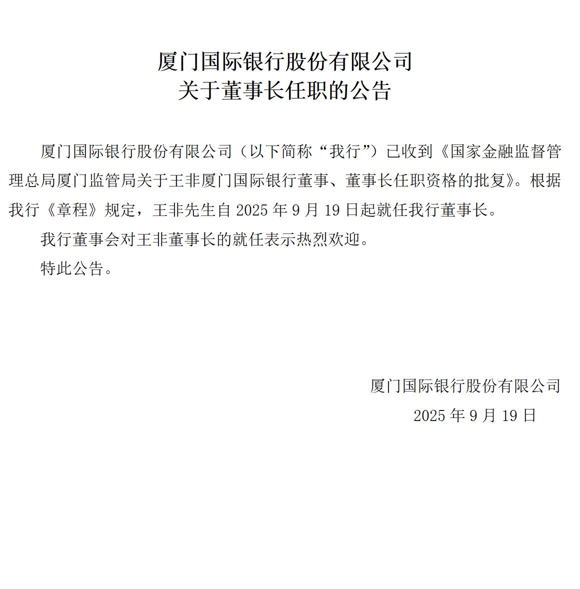 厦门国际银行股份有限公司关于董事长任职的公告