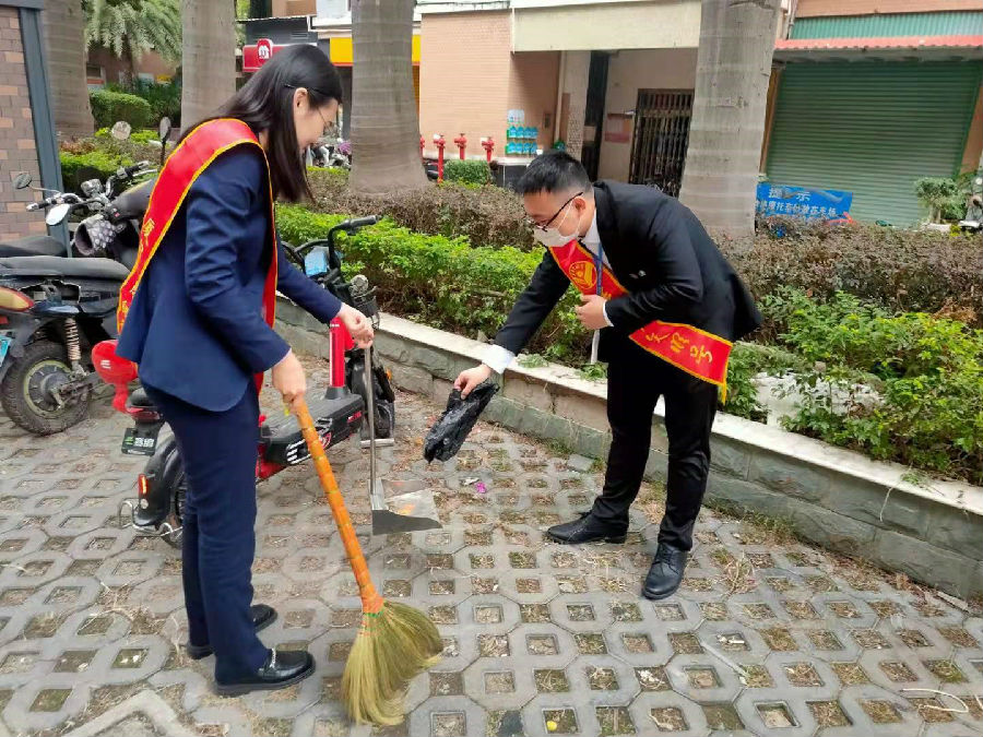 2020年11月30日,分行营业部青年志愿者前往周边社区进行道路清洁,活动中向社区居民传递爱护环境、垃圾分类理念,呼吁大家共同维护漳州市容市貌。